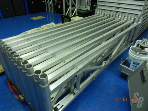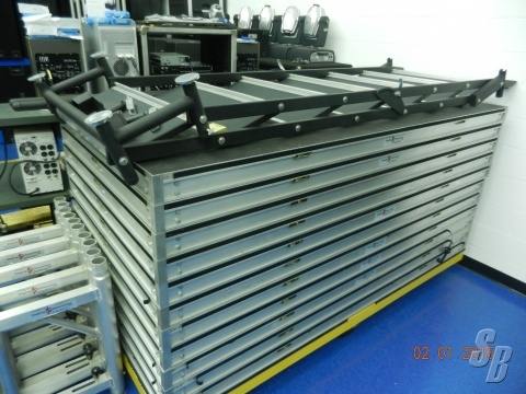 EXTRAS: ALSO INCLUDED IS 36 LINEAL FEET OF STAGING DIMENSIONS BLACK STAGE CURTAIN FOR STAGE FRONT, ADJUSTABLE FROM 36 TO 56 INCHES TO CONCEAL THE UNDERSIDE OF THE STAGE, AND A 9 STEP STAIRWAY WITH DUAL HAND RAILS. THE STAIR IS ADJUSTABLE FROM 36 TO 72 INCHES STAGE HEIGHT. A ROAD CASE WITH HEAVY DUTY CASTORS IS PROVIDED FOR THE MISCELLANEOUS HARDWARE AND TOOLS. THERE ARE TWO CUSTOM BUILT CARTS, EACH CARRYING 11 OF THE FLOOR PANELS. THE CARTS ARE OF THE RAIL-WAY LUGGAGE DESIGN WITH A CENTER AXLE WITH 6 AMERITIRE FLAT-PROOF WHEELS, AND 4 INDUSTRIAL GRADE HEAVY DUTY CASTORS AT EACH END. HEAVY DUTY RATCHET STRAPS HOLD THE PANELS SECURE ON THE CARTS.