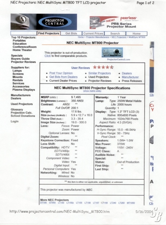 HISTORY: USED THIS PROJECTOR FOR PERSONAL USE. GREAT FOR WATCHING MOVIES OUTSIDE WITH A SCREEN MADE OF FABRIC APPX 30 FT DIAGONAL. USED WITH A PC AND THE REMOTE CONTROL WITH THE IR RECEIVER.
