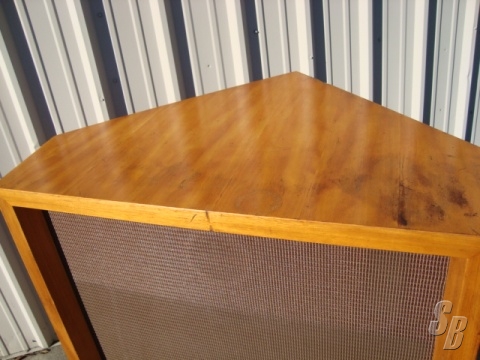 FEATURES: IT'S A LANSING C-31 CORNER SPEAKER CABINET WITH "PRIMA VERA BLONDE FINISH". VERY GOOD CONDITION EXCEPT A COUPLE OF MINOR DENTS IN SIDE WOOD, AND A COUPLE OF MINOR MARKS (BURN?) ON TOP OF CABINET.