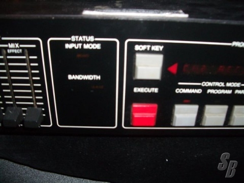 ADDITIONAL CONTROLS: TWO INPUT FADERS, TWO OUTPUT FADERS, TWO DRY/EFFECT FADERS. PROGRAM SELECT, PARAMETER SELECT, COMMAND KEY (FOR ADDRESSING PRESETS, HELP TEXT, SELF TEST AND MORE), EXECUTE KEY, ADJUST/SELECT SLIDER, DEFINE KEY, AND SOFT KEY (EXECUTES SPECIAL PROGRAM FEATUES), OUTPUT MONITOR BUTTON AND ON/OFF SWITCH.